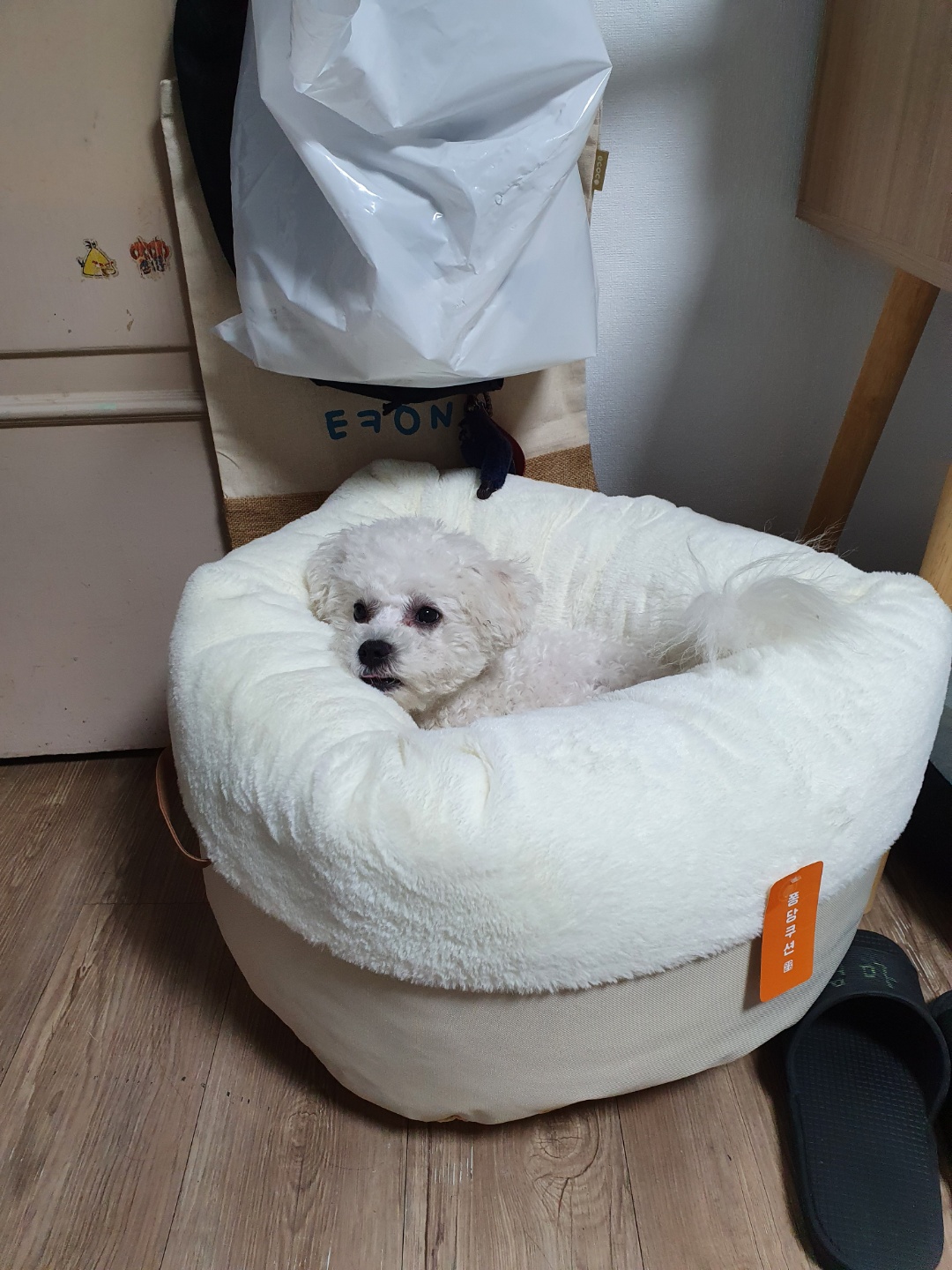사진에 다이소 애견 방석은 좀 작아 보이죠? 그래도 엄청 잘 들어가고 그랬는데... 들어가서 잠도 잘 자고 ㅋㅋㅋㅋㅋㅋㅋㅋㅋㅋ 근데 저 방석에 토를 해버려서 ㅠㅠ 깨끗하게 빨아서 놔뒀는데도 안 들어가기..........