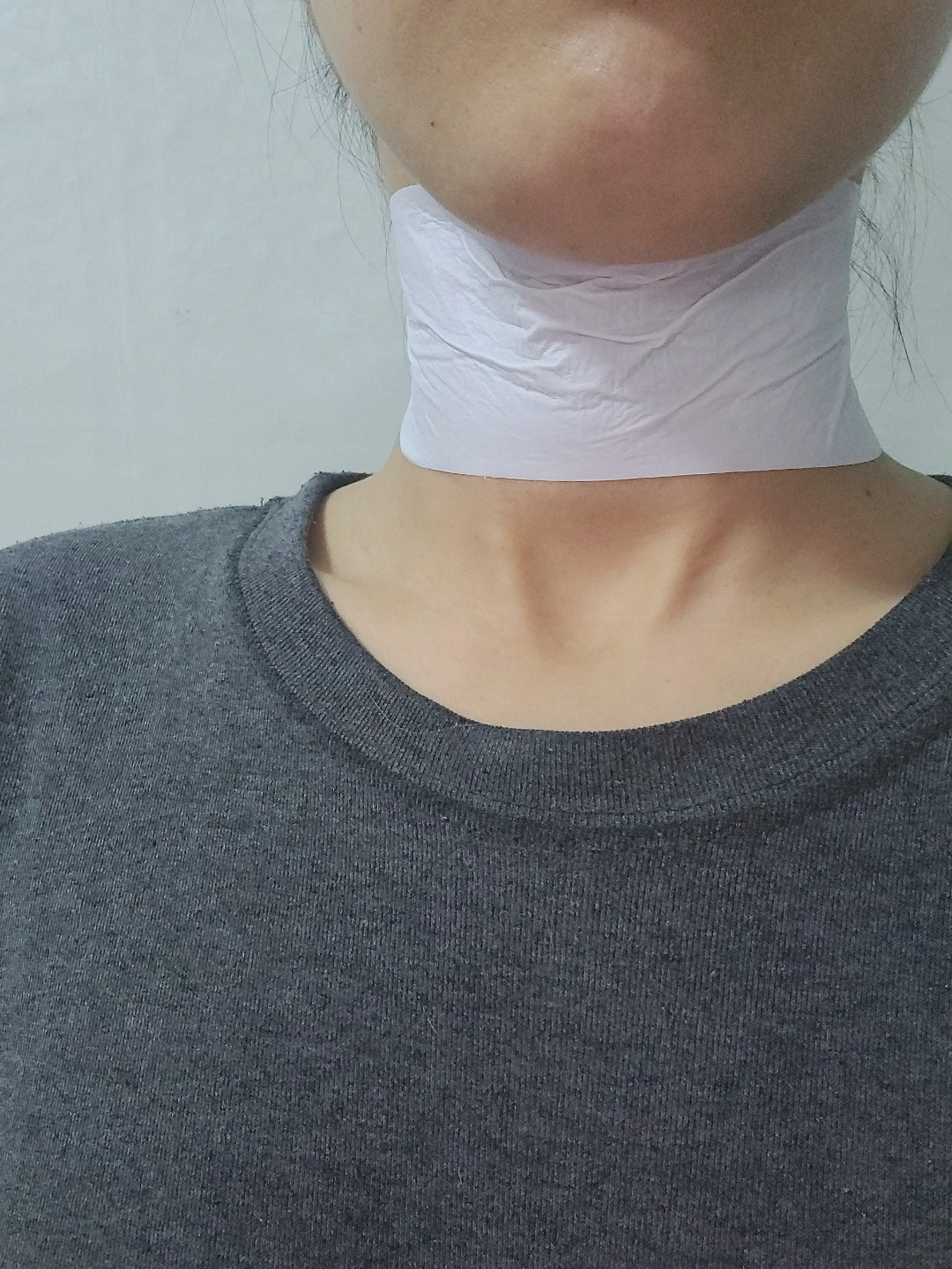 짜잔! 개봉을 하면 반 접힌 요런 아이가 나와요ㅎㅎㅎ 사용방법은 일단 깨끗하게 세안 후, 스킨 및 토너를 이용하여 피부결을 정돈해요. 그다음 크림이 코팅되어 있는 면에 필름이 붙어 있어요! 그 필름을 제거해 주고 크림이 코팅된 면이 목 부위에 닿도록 바르게 위치시킨 후, 고르게 밀착시켜줘요.