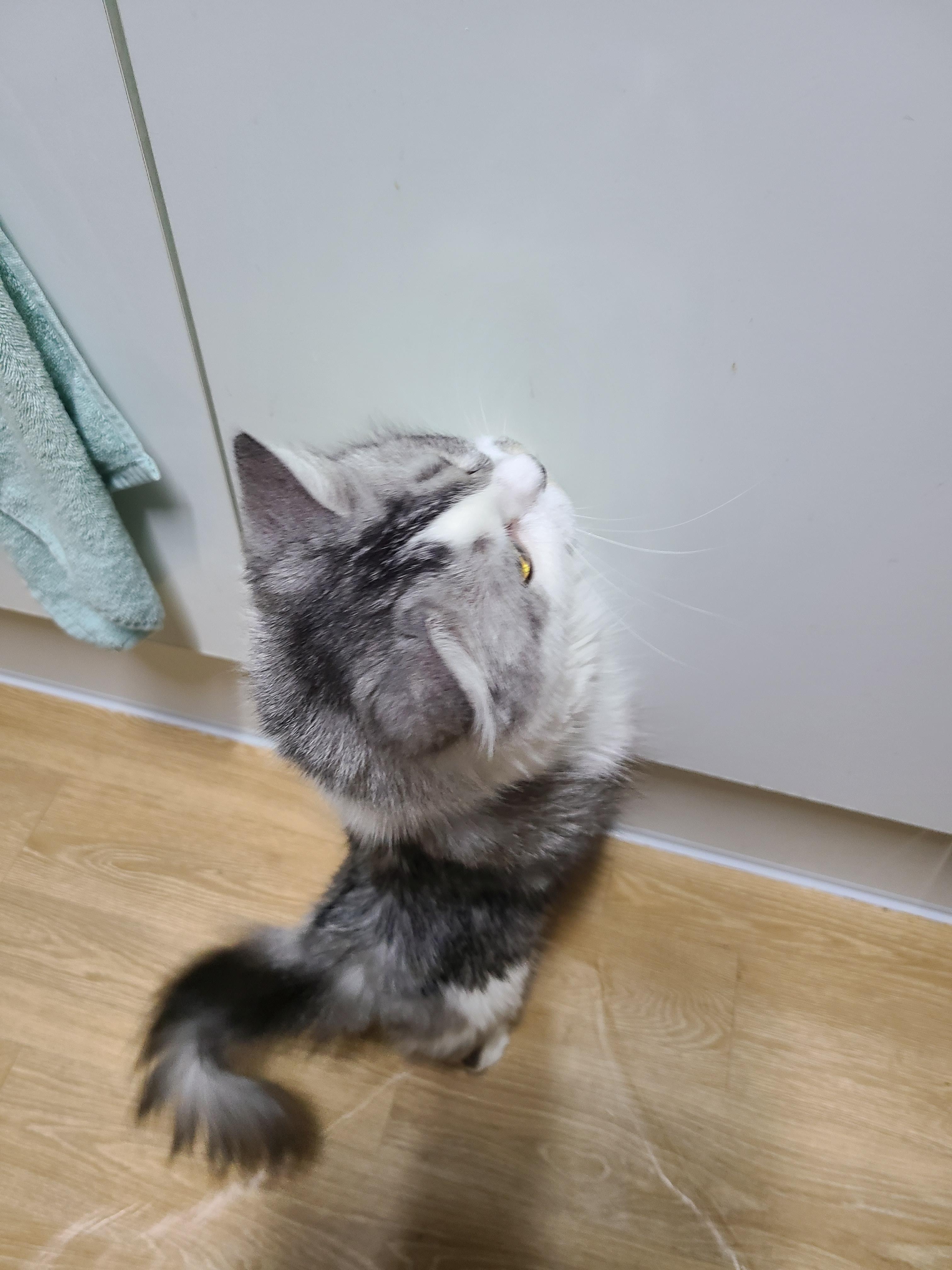 보이시나요? 육포 딱 꺼내들면 저래요ㅋㅋㅋ 육포가 좀 딱딱한 편이라 혹시라도 먹다가 목에 걸릴까봐 잘게 다지듯이 썰어주는데... 썰고 있으면 저렇게 난리가 나요ㅋㅋㅋㅋㅋ 싱크대 선반쪽에 뛰어 오른적도 있다는...